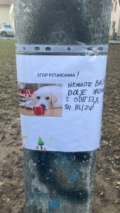 Vrijeme je Božića, vrijeme ljubavi, nade, mira, praštanja i dobrote. Božić je vrijeme kada se okuplja obitelj i naglašava briga za druge, zajedništvo i darivanje. I kućni ljubimci zauzimaju važno mjesto u našim obiteljima. Iskazuju nam svoju nesebičnu ljubav i privrženost, a mi, uz odrastanje s njima, razvijamo empatiju, odgovornost i naviku da brinemo za druge. Ono što nama, ali i našim macama i psima ne odgovara je bučno slavljenje blagdana koje počinje već početkom prosinca. Pucanje petardi i slične pirotehnike naši kućni ljubimci čuju 8 puta jače od nas. Zato su prestrašeni i uznemireni pa cvile, tresu se od straha, laju, traže sigurno mjesto, srce im jako lupa ili ne žele izaći vani iz kuće. Zbog potrebe da zaštitimo kućne ljubimce u našem okruženju, učenici 4 .b i 4. c razreda sa svojim učiteljicama Sanjom i Andrejom pokrenuli su „kvartovsku“ inicijativu „Stop petardama“. Izradili su plakate kojima žele upozoriti na ovu problematiku kako bi se smanjila upotreba petardi i slične pirotehnike. Plakate su zalijepili za ulične stupove kako bi zamolili svoje susjedstvo da ne koriste petarde. Time bi se zaštitili i naši kućni ljubimci i djeca i ostali, a blagdane bismo proveli u ugodnijem božićnom ozračju.